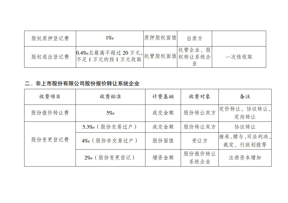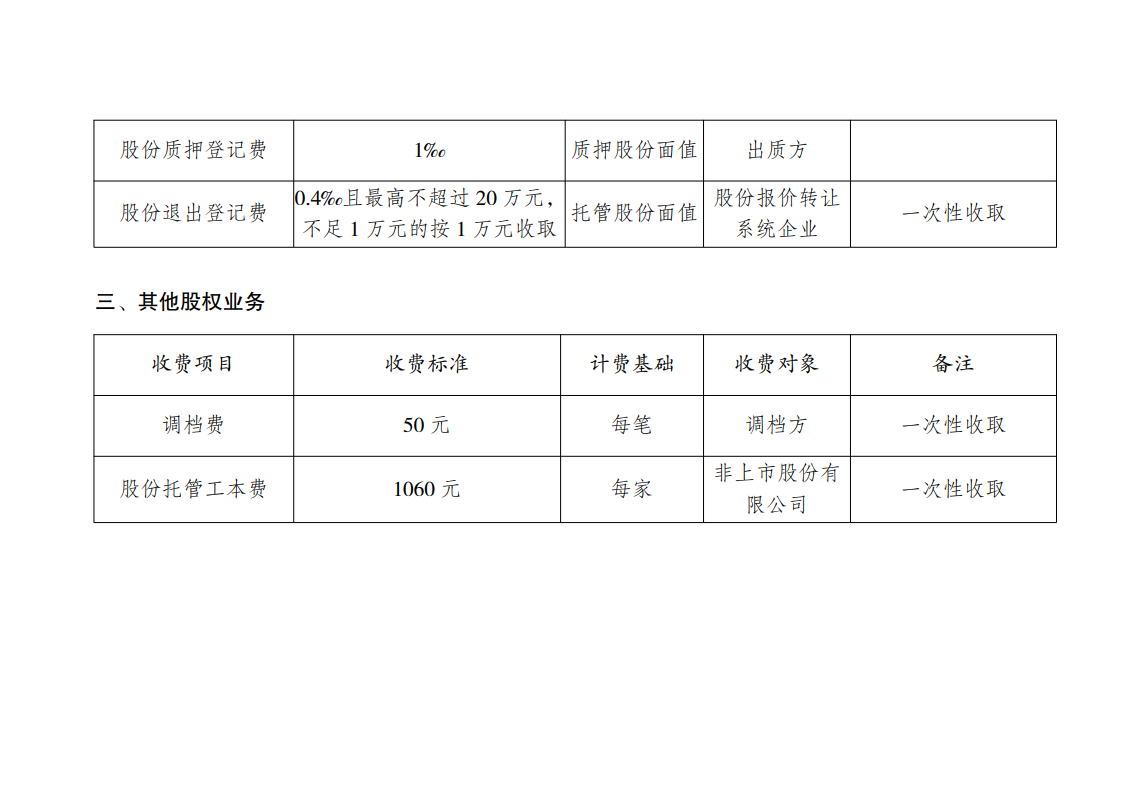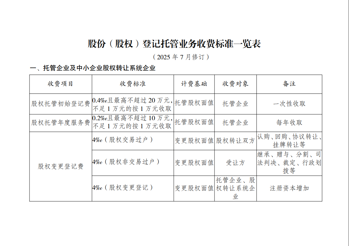 股份(股权)登记托管业务收费标准一览表